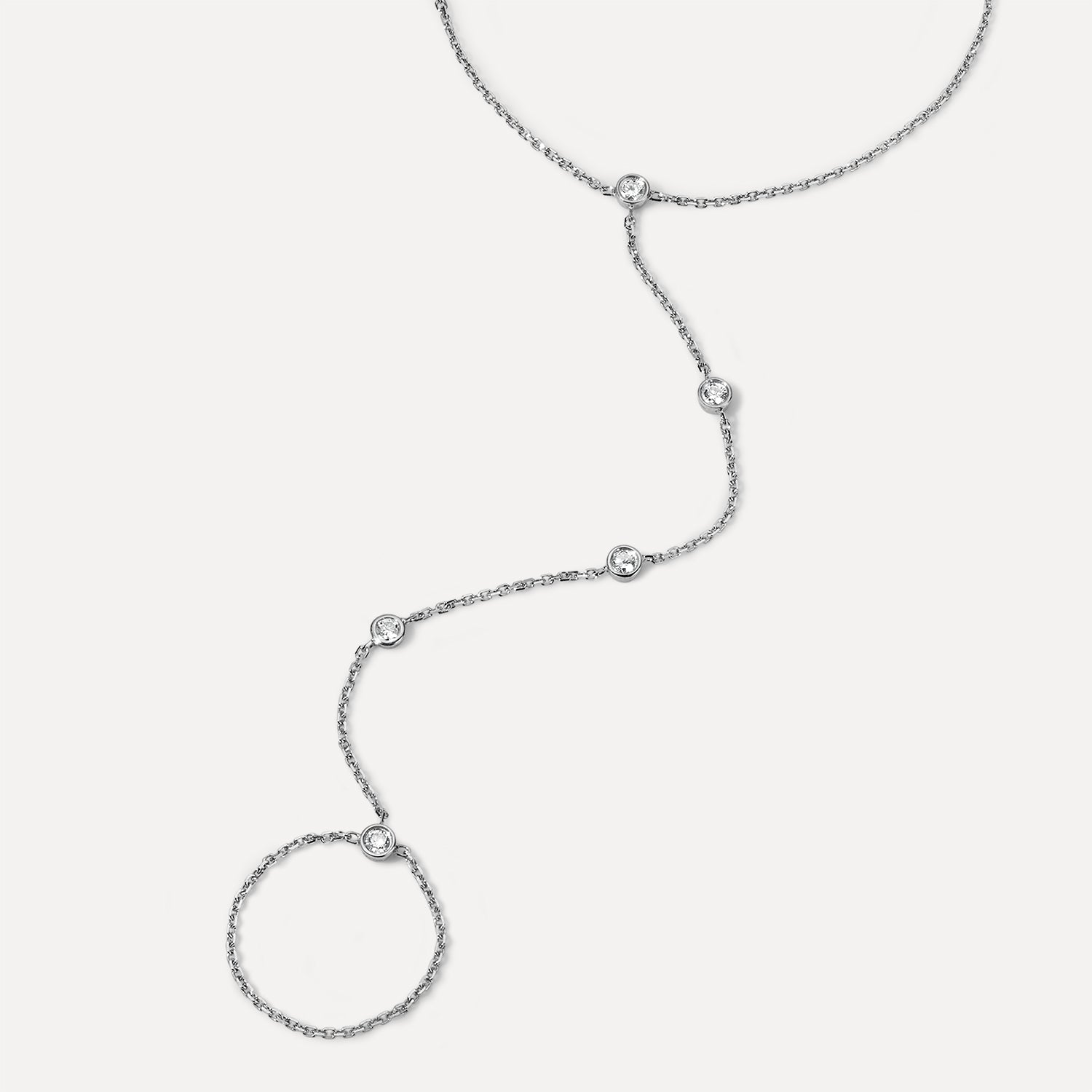 This hand chain bracelet brings effortless elegance to every gesture. Crafted in 14K gold, it features five natural round-cut diamonds (0.05 ct each, total 0.25 ct) set along a delicate chain that connects the wrist to the finger. Each bezel-set diamond adds a whisper of sparkle, catching the light with every movement.